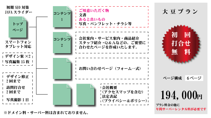 スマートフォン・タブレット対応、またJAVAスライダーにて、視覚的にも満足していただけるプランです。