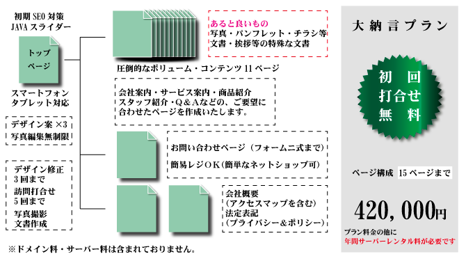 スマートフォン・タブレット対応、またJAVAスライダーにて、視覚的にも満足していただけるプランです。圧倒的なボリュームにて多くの情報を発信できます。